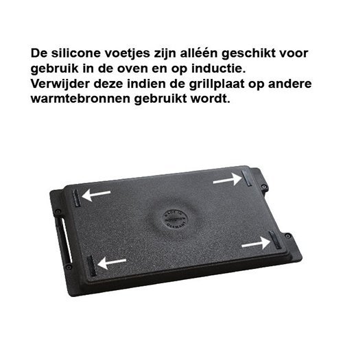 Deze grillplaten zijn uitgerust met siliconenvoeten, waardoor ze niet op inductiekookplaten kunnen uitglijden en het koken met onze grillplaten gemakkelijker wordt. De siliconen voetjes zijn alleen geschikt voor inductiekookplaten! Bij gebruik op andere soorten fornuizen, zoals keramiek, gas of elektrisch, moeten de siliconenvoetjes worden verwijderd.